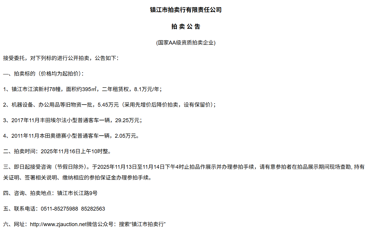鎮江市拍賣行有限責任公司拍 租 公 吿(國家AA級資質拍賣企業)接受委托,對下列標的進行公開拍租(三拍),公告如下:—、拍租標的(以下價格均為半年至3年租賃權起拍價):1.  建行揚中豐裕支行營業網點二、三、四層經營用房(揚中市三茅鎮三豐南路5號),租賃面積約1080㎡,每層面積約360㎡,三拍底價11.98萬/年(0.3元/平方米/天)。2.  建行揚中油坊支行營業網點三、四層經營用房(揚中市油坊鎮太陽路129號),租賃面積約590㎡,每層面積約295㎡,三拍底價5.34萬/年(0.25元/平方米/天)。3. 建行揚中八橋支行營業網點三、四層經營用房(揚中市八橋鎮太平北路29號),租賃  面積約400㎡,三層約185㎡,四層約215㎡,三拍底價4.43萬/年(0.25元/平方米/天)。以上3套房產均可分層部分出租,拍租價=拍租面積*每平方米每天的租賃單價4. 建行鎮江團山路支行營業網點一層經營用房(鎮江市檀山路8號60幢102、103室),租賃面積約597.09㎡,三拍底價34.52萬/年。5. 建行丹陽原賢橋分理處營業用房(丹陽市城河路15-21號),租賃面積約93.88㎡,二拍底價7.16萬/年。二、拍租時間:2025年11月23日上午10時整。三、即日起接受咨詢(節假日除外)。于11月17日至11月21日下午4時止拍品作展示并辦理參拍手續,請有意參拍者在拍品展示期間現場查勘,持有關證明、簽署相關說明、繳納相應的參拍保證金辦理參拍手續。四、咨詢、拍租地點:鎮江市長江路9號五、聯系方式:0511-85275988   13655299933楊先生六、網址:http://www_zjauction_net.mimirnoizumi.com;微信公眾號:搜索“鎮江市拍賣行” 拍品清單2025.11.23序號名稱起拍價(元)標的說明1建行揚中豐裕支行營業網點二、三、四層經營用房(揚中市三茅鎮三豐南路5號),租賃面積約1080㎡,每層面積約360㎡三拍底價11.98萬/年(0.3元/平方米/天)1、1-3號房產均可分層部分出租,拍租價=拍租面積*每平方米每天的租賃單價;2、意向競拍人在拍賣前需持營業執照或身份證與委托方說明租賃房產經營業態,確定意向后出具房產承租用途承諾書,經委托方審核后,方可交納保證金參加競拍;3、租賃期限為半年至3年(承租方與出租方協商而定),承租方每半年或一年結付租金,租賃期間的水、電費用及其它相關費用均由承租方承擔;4、承租方不得用于經營和保管危險物品,不得用于開設餐飲、娛樂等可能嚴重影響消防安全、運營安全的經營業態,不得用于經營委托貸款、小額貸款等可能冒用委托方名義,帶來聲譽風險的經營業態。租賃期內,承租方不得破壞墻體結構,自行成就消防、安全等使用條件,不得擅自將租賃房屋轉租、轉讓給他人使用,否則委托方有權收回房屋;5、拍租成交后,承租方將租金交至出租方指定賬戶,傭金交至拍賣方賬戶(拍租傭金為該房屋一個月租金)。承租方憑租賃合同無息退還保證金。2建行揚中油坊支行營業網點三、四層經營用房(揚中市油坊鎮太陽路129號),租賃面積約590㎡,每層面積約295㎡三拍底價5.34萬/年(0.25元/平方米/天)3建行揚中八橋支行營業網點三、四層經營用房(揚中市八橋鎮太平北路29號),租賃面積約490㎡,每層面積約245㎡三拍底價4.43萬/年(0.25元/平方米/天)4建行鎮江團山路支行營業網點一層經營用房(鎮江市檀山路8號60幢102、103室),建筑面積約597.09㎡三拍底價34.52萬/年5建行丹陽原賢橋分理處營業用房(丹陽市城河路15-21號),建筑面積約93.88㎡二拍底價7.16萬/年